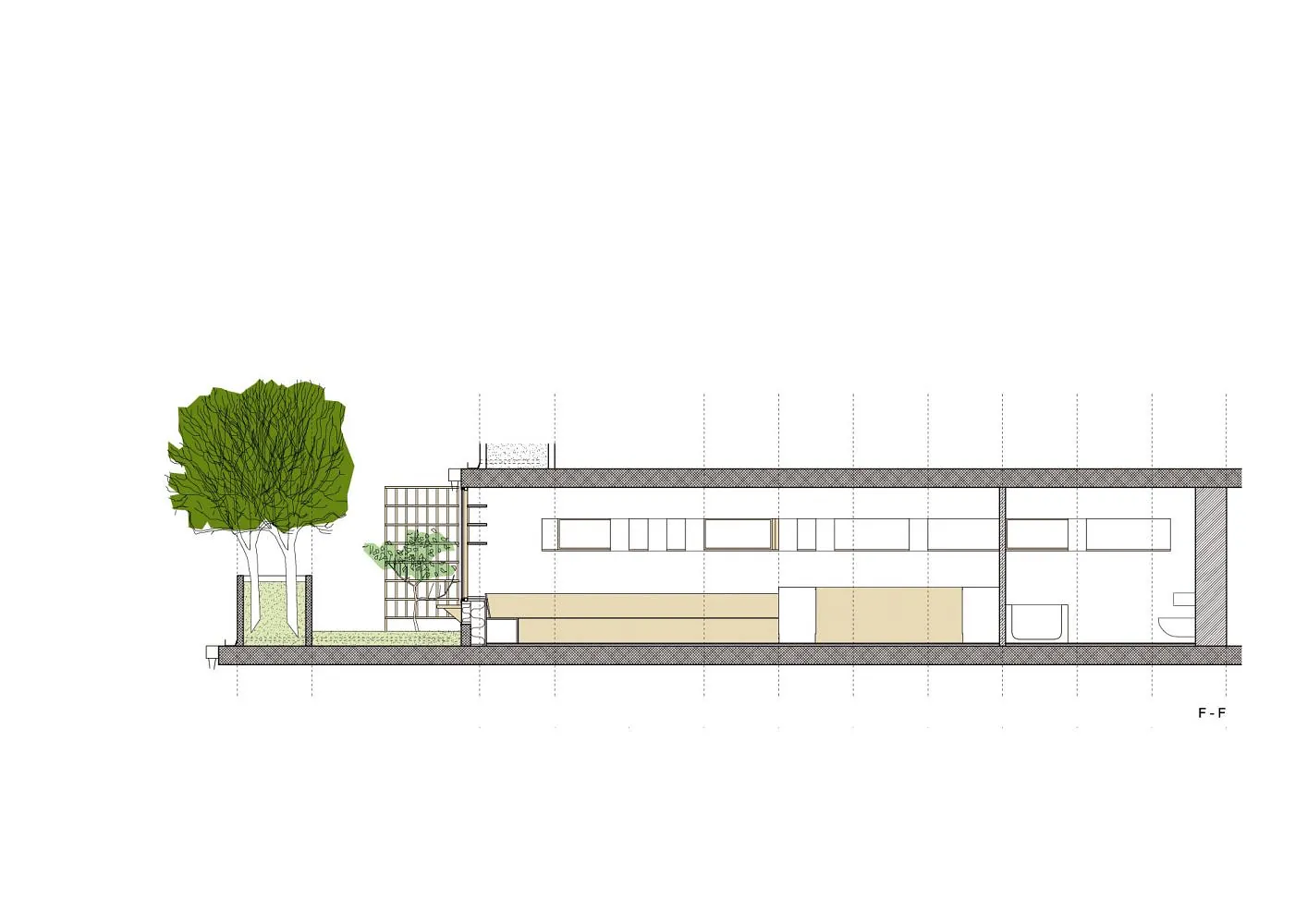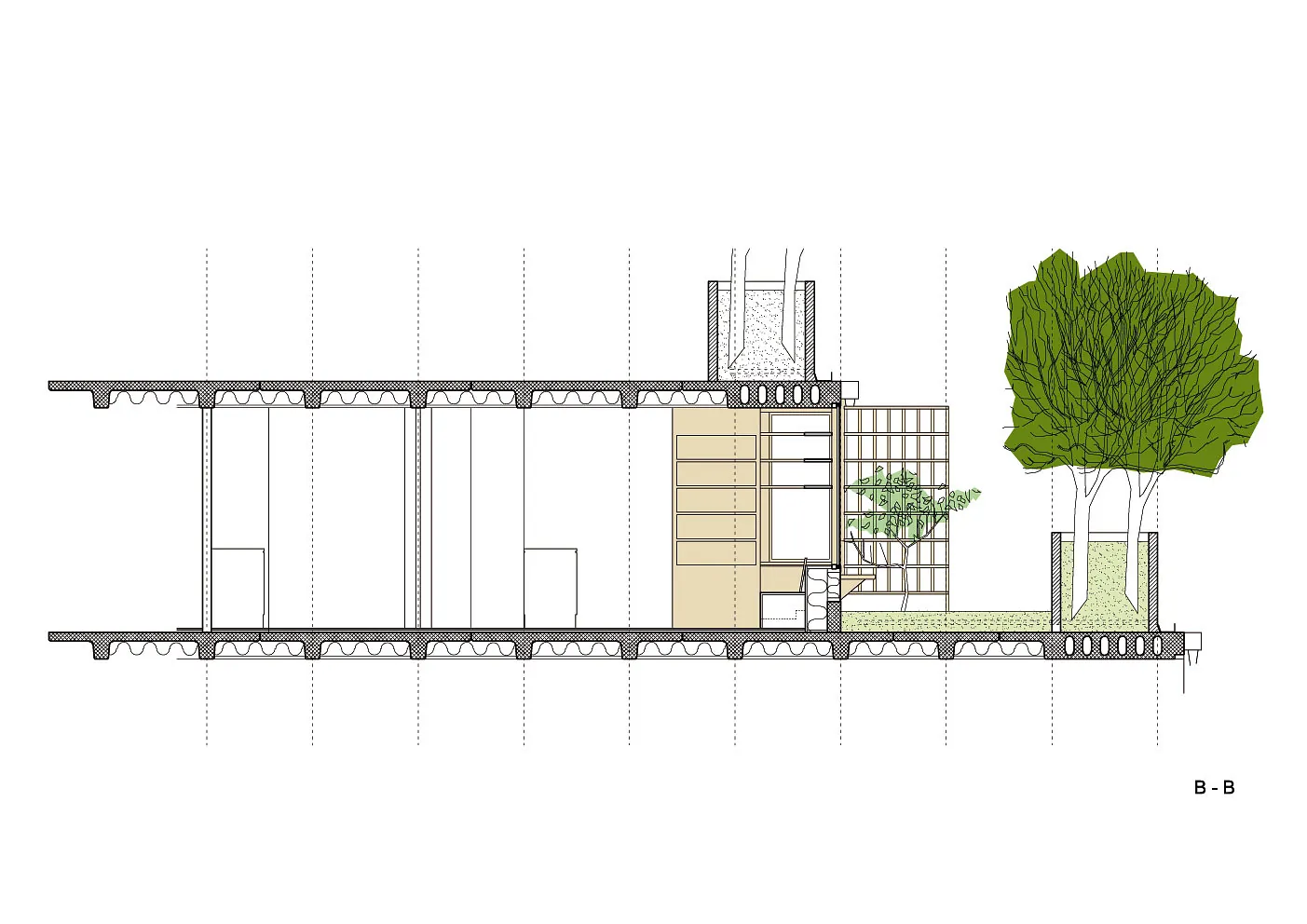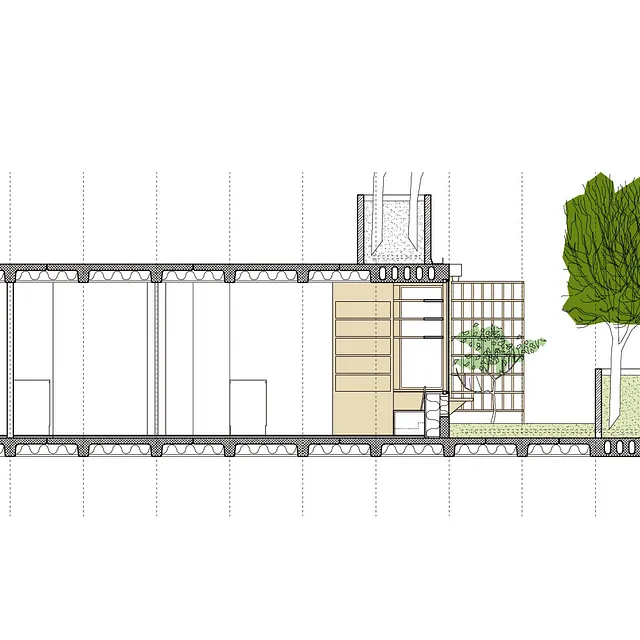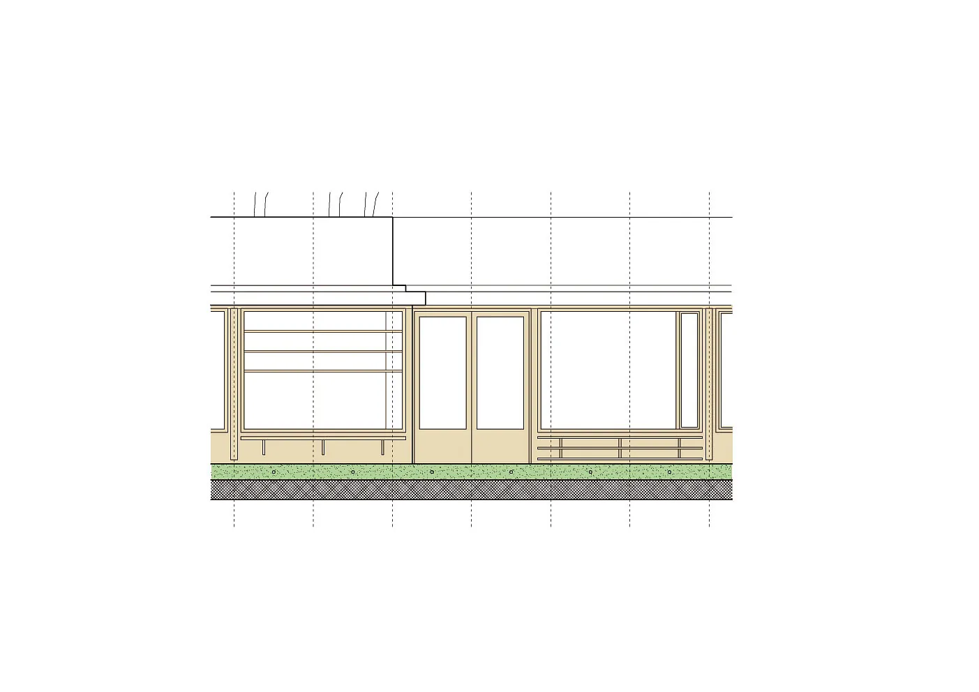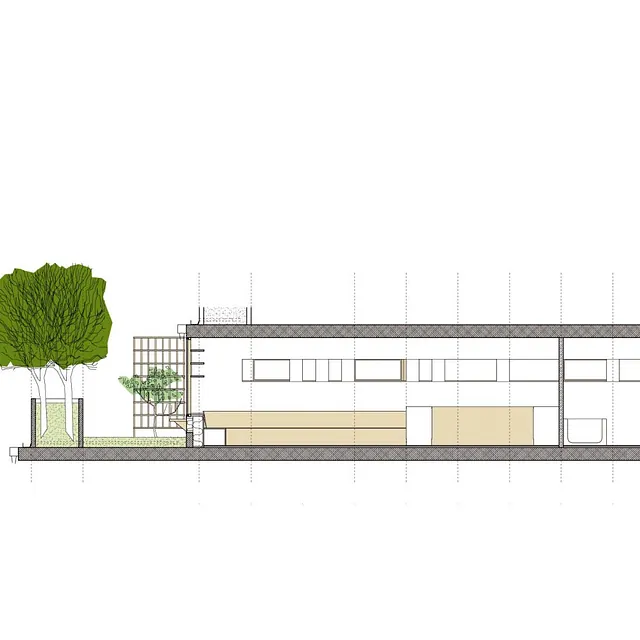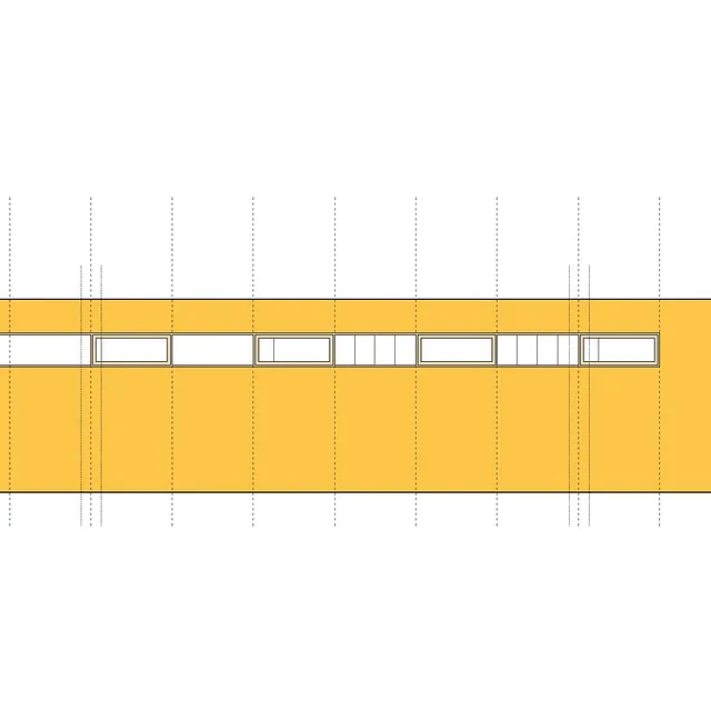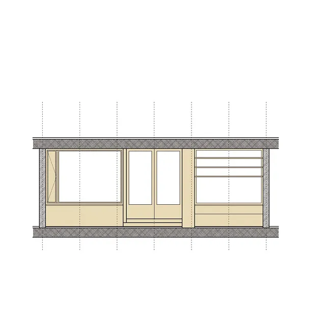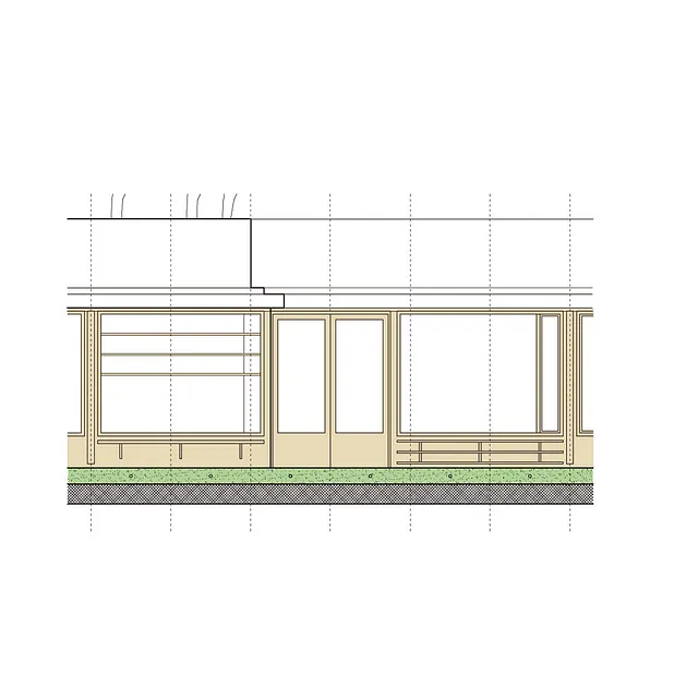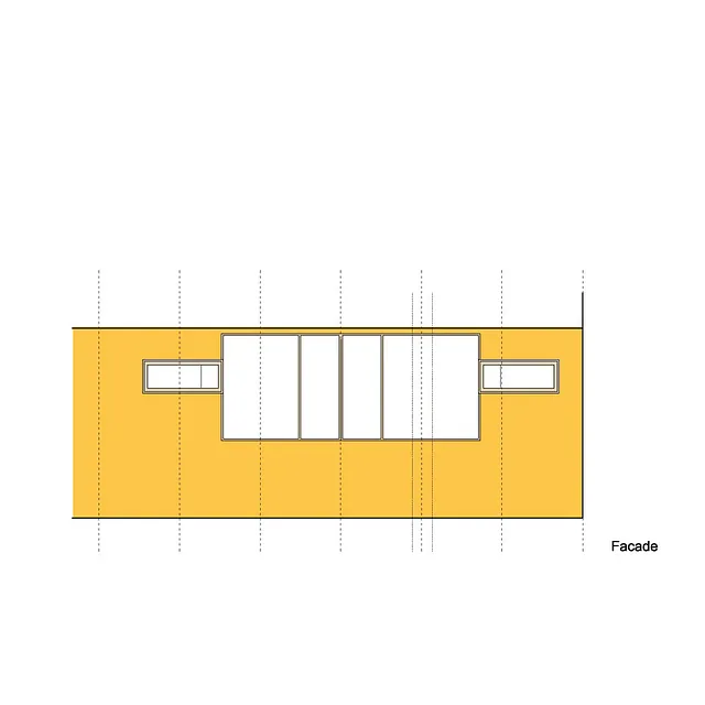 Facadematerialet mod sydvendte havearealer er primært store oplukkelige skyde-glaspartier i trærammer, varieret med særlige træpaneler (som hindrer indkig og skærmer for sol), samt indbyggede slagbænke i træ som samtidigt giver ekstra opbevaringsplads.
