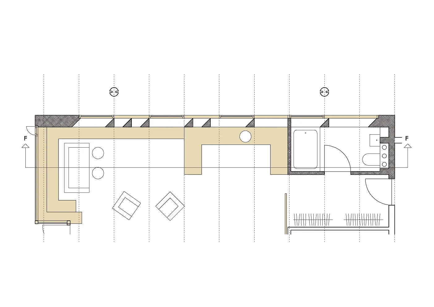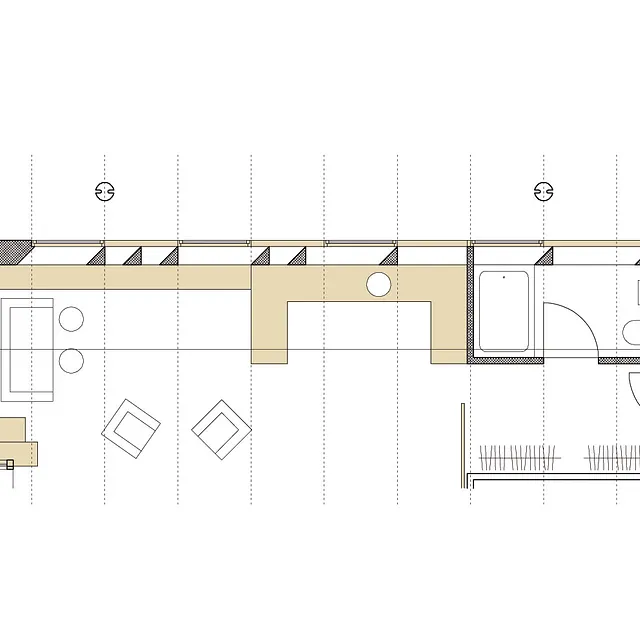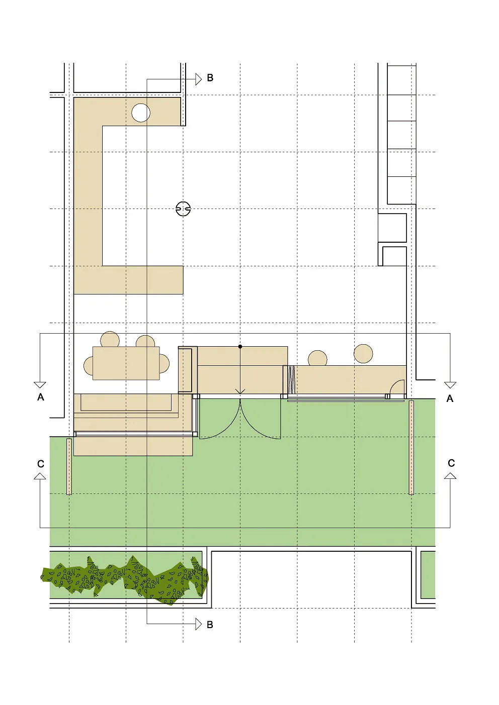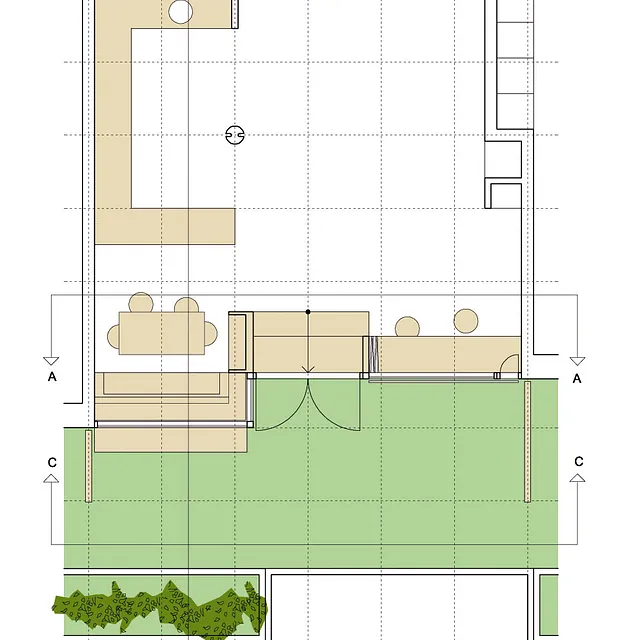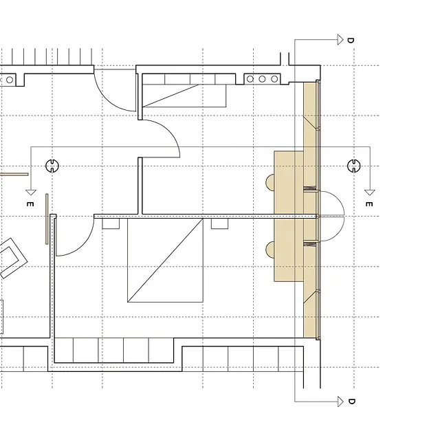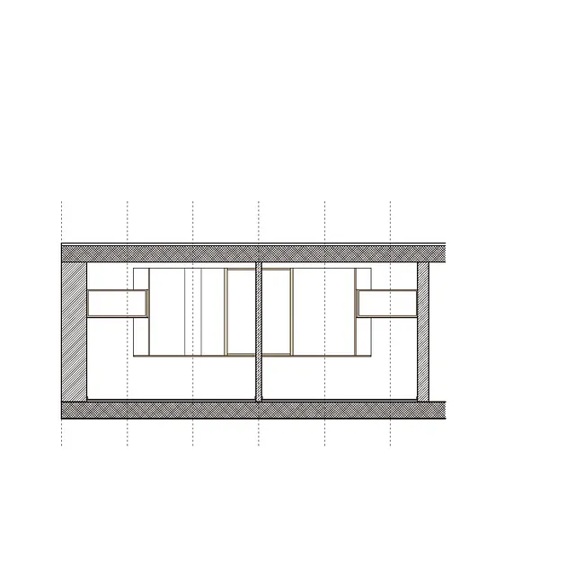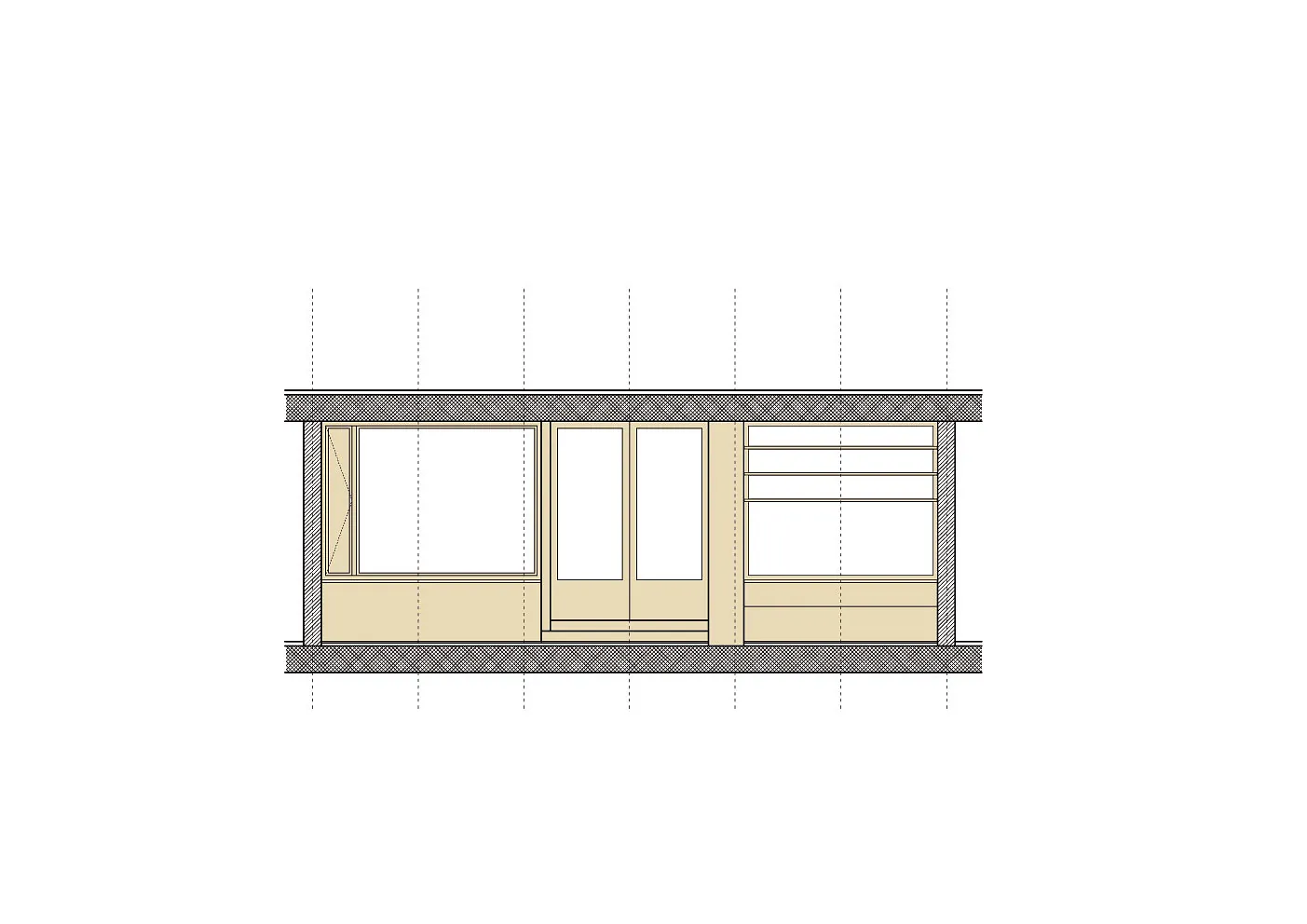 Facadematerialet mod sydvendte havearealer er primært store oplukkelige skyde-glaspartier i trærammer, varieret med særlige træpaneler (som hindrer indkig og skærmer for sol), samt indbyggede slagbænke i træ som samtidigt giver ekstra opbevaringsplads.